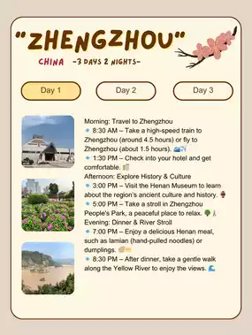 •	🚇 Transport: Start at Henan Museum (Metro Line 2, Guanhutun Station), walk to Wenbo Park, then take Line 1 to Erqi Square Station.