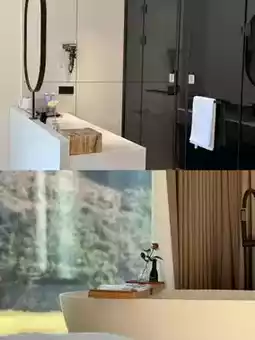 The indoor facilities are well-equipped, with smart controls, speakers, and smart toilets. The bedding is soft and cozy, perfect for lying down and enjoying the view. The bathroom has a dry and wet separation, disposable toiletries, and a bathtub. After a tiring day, soaking in the tub to relieve fatigue is super convenient.
