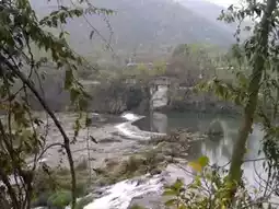 In the Huangguoshu Scenic Area, the karst mountains stand deep and verdant, veiled in misty rain. Clear streams tumble over stone dams, churning into white spray, while an ancient stone bridge and walkway trace the water's edge. Lush trees line the banks, dotted with crimson maple leaves and soft pink blossoms, adding poetic color to this waterside stone forest—a scene that captures nature's freshness and subtle vitality.