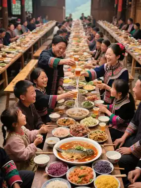 18:30 Sour Soup Fish Long Table Banquet: mountain stream toasts and songs make kids roll on the ground laughing, colorful glutinous rice arranged in flower shapes, even picky eaters fight to eat