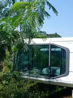 and the interior is a space capsule with large floor-to-ceiling windows. 🪐