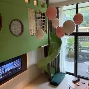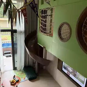 A 1.8-meter bed, a children's bed, a slide, and a garden