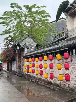 Sanxi Village in Zhongshan, shrouded in gentle rain, feels like a forgotten poem of time. Raindrops tap lightly on the green bricks and black tiles, while a thin mist rises between the alleys. Centuries-old houses soak in the water's hues, with vines cascading down like natural bead curtains. Escape the hustle and bustle, stroll under an umbrella along the wet stone paths, and let the warm yellow glow from café windows and the aroma of hand-brewed coffee mixed with the earthy scent of damp soil envelop you.