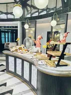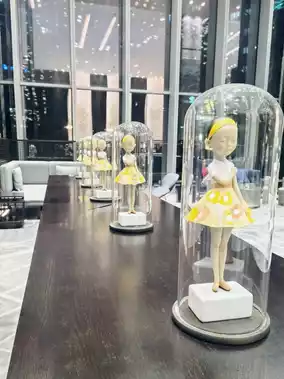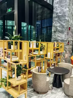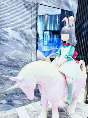 Upon entering the lobby, the first thing that catches your eye is the unique front desk design. The lip-shaped front desk island in the distance is novel and refreshing. The front desk background wall is grand and unique, and the decorations on it are like blooming flowers, showing artistic beauty. There are also cute "sleeping baby" cartoon character installations in the lobby. A row of "sleeping babies" protected by transparent covers, wearing yellow dresses with polka dots, are quiet and well-behaved, as if guarding every guest's sweet dreams. There is also a little girl riding a dreamy unicorn, with exquisite shapes and soft colors, adding a touch of childlike fun and dreamy atmosphere to the lobby.