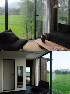 The courtyard overlooks thousands of acres of rice fields, featuring a design aesthetic that is simple, quiet, concise, yet slightly rugged. It is located at the corner of the road by the thousand-acre rice fields in Yakou Village, offering a panoramic view of the vast rice fields and a chance to enjoy the magnificent sunset in the evening.