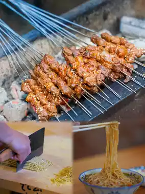 Flat bean noodles/Artemisia noodles. The portions are large and well-seasoned. The braised tofu is a local classic snack and is indeed good. The meatballs are similar to lion's head meatballs.