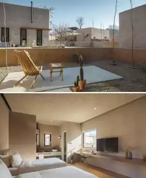When you step into this loess courtyard, you will unconsciously blend into the slow life of Zhongwei. The hotel's 15 rooms, with the smell of earth, are scattered in this open yet enclosed courtyard space. The original wood makes the loess walls look warmer, and the minimalist interior decoration and colors are hidden in the thickness of the space, bringing a sense of fusion after the collision of modern and traditional aesthetics.