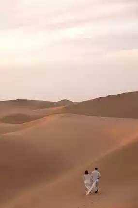 They cuddle on the sand dunes, watching the sunset dye the sky orange and pink; the moment she lifts her veil, even the wind softens; in his gaze toward her, the entire desert's romance is hidden.