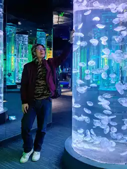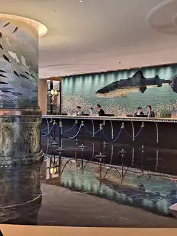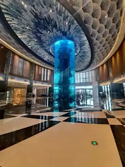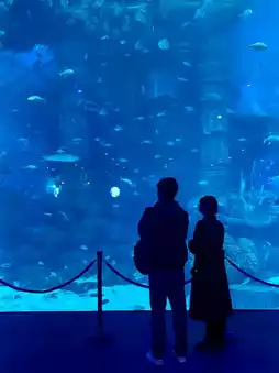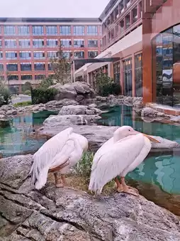 As soon as we entered the hotel, we were amazed by the 12.8-meter-high cylindrical coral fish tank, the "Pillar of the East China Sea." It was stunning and magical. There were also pelicans strolling around, and the kids gathered around them. We followed suit and watched these big and adorable pelicans. They were so cute!