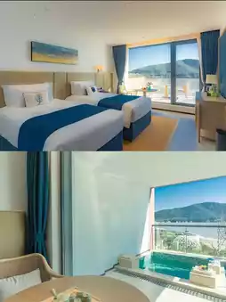 🛏 There are many room types, including garden view, sea view, sea island theme rooms, and room types with indoor private hot spring pools. I stayed in a sea view terrace room, and the 30–40㎡ space is very spacious. When you open the curtains, you can see the endless sea 🌊 It's so pleasant to lie in bed and watch the sunrise over the sea! The bed in the room is big and soft, and it's super relaxing to sleep in. There is also a smart AI assistant, so you can just call it if you need anything.