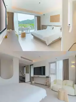 The homestay is tucked by the sea in Tawan Village, just a 5-minute walk to the big sandy beach. The best part is that some room types feature panoramic floor-to-ceiling windows and extra-large balconies, allowing you to lie in bed and enjoy the seamless view of sea and sky, with mountains and fields in full sight. The modern minimalist design is super photogenic, with pure white bed canopies and natural wood furniture—every shot looks like an Instagram masterpiece.