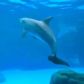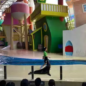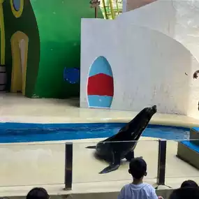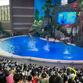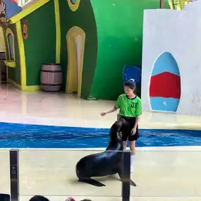 The Dolphin Theatre can accommodate nearly 6,000 spectators, and there were about 4,000 people watching our show. When the official performance music sounded, before we could react, five or six baby dolphins appeared quickly like swords drawn from their sheaths. The visual effect was shocking, and the audience immediately burst into applause as soon as they reacted. The dolphins' performances are lively and cute. They do various movements under the guidance of the trainers. After each performance, they run to their trainers to ask for food rewards like children asking for candy. They are so cute and naive.