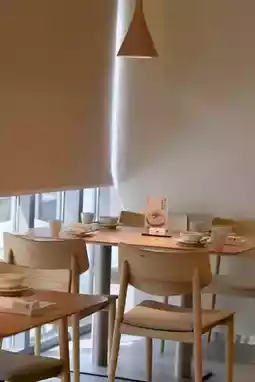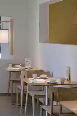 Creamy white paired with pure wooden tables! Simple but not simplistic!