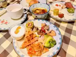 The temple fair buffet in the evening was held in a large ancient costume street built in the resort, which was like a movie set. In addition to check-in spots such as small bridges and flowing water, there were also different shops, seafood, meat, tonic soups, vegetables, fruits, drinks, ice cream, desserts and other delicacies prepared on the spot. The food quality was super high 👍🏻👍🏻👍🏻 Guests can wear the yukata provided by the hotel and pick up delicacies from any shop at will. Don't miss the roasted oysters, Taigong roasted pork, pearl milk tea, peanut ice cream, and ice fried yogurt. It happened to be Halloween that day, so there were many ghost delicacies on offer 🤪🥳😜 There were also various singing and dancing performances at different locations on the scene, and there were also many free booth games to win small gifts. There were so many programs that made people linger, and 4 hours was really not enough to eat, drink and have fun. The next day, breakfast was also buffet style, with both Chinese and Western food, and a wide variety. The only worry was that the resort would go broke.