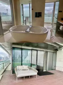 The elegant suite is nominally a suite, but it is actually an open-plan guest room simply separated by a TV cabinet, but this does not affect the comfortable experience it provides. The room is spacious and the layout makes you feel very comfortable. There is a large balcony with a sea view, from which you can clearly see the Macau Peninsula and Hengqin New Area in the distance, with the Grand Lisboa Hotel and Macau Tower in full view, offering an excellent view. The bathroom is very spacious, with a small cloakroom, and the shower, toilet, and bathtub are traditionally separated into three sections. The washstand also has double sinks, which are very convenient to use. The room is equipped with a retro coffee machine, round coffee capsules, a water heater, and a Nespresso commercial coffee machine, which is perfect for coffee lovers.