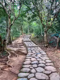 As you step into the ancient road, the heavy sense of history hits you. The stone road is winding and covered with moss, telling the story of time. The surrounding trees are towering with lush branches and leaves, blocking out the scorching sun.