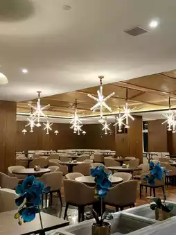 Floor-to-ceiling windows face the Sun Moon Shell, offering azure seas and skies by day