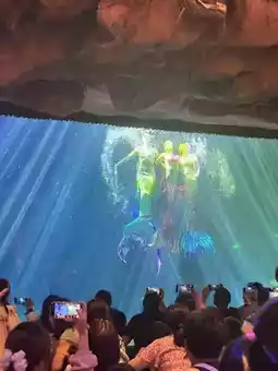 4️⃣ Mermaid Fantasy Show, mermaids dance gracefully in the water and interact with marine life. Since they sit on the ground, it is recommended to find a good seat in advance. Spaceship,