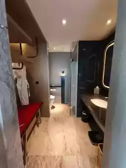 🛏️🛁 Room items/facilities: The room and bathroom can overlook the Hong Kong-Zhuhai-Macao Bridge, and the bathroom is very large. The bathtub is in the shower area, so it won't get wet around you👍🏼! The mattress is also very comfortable, not too hard or too soft. We had two adults and two children and were given 4 bottles of free water. All items for children can be collected by calling the front desk, and the waiter will deliver them to the room. For example, when we went swimming, we took two more bathrobes for the children.