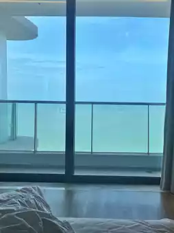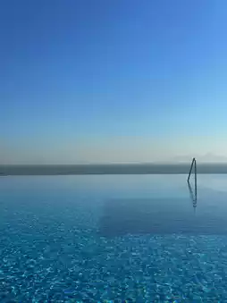 Situated at a high point of the hotel, the pool seamlessly blends with the ocean. Standing at the edge, you’ll see rippling waves beneath your feet and the horizon where the sea meets the sky. The stunning view encompasses blue skies, white clouds, and the vast azure sea.