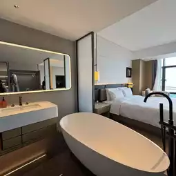 Opening the door, the floor-to-ceiling windows are breathtaking! You can enjoy the sea view right from the bed and even watch helicopters take off and land ✈️. The latex pillows are super soft, ensuring a good night's sleep every night.