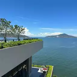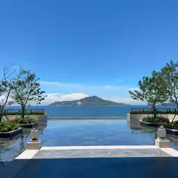 Nestled between mountains and the sea, the hotel features white walls, black tiles, gardens, and pavilions, exuding a serene Zen vibe. The moment you step into the lobby, you're awestruck by the giant bamboo art installation paired with mountain-and-water-inspired lighting effects—every snapshot is Instagram-worthy📸. The grounds are surrounded by ancient trees, and walking amidst birdsong instantly transports you away from the hustle and bustle of city life🌿.