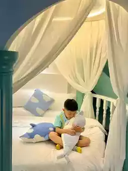 We arrived in the evening, and the front desk welcomed us warmly, making us feel right at home. CC was overjoyed! The double-decker castle bed, children's slide, dreamy carousel, large bathtub, and more—so much fun to play with 👍 The kids stayed up late, not wanting to sleep 😅😅 Meanwhile, I lounged on the sofa watching the projector TV—so hassle-free. The hotel's amenities are super kid-friendly: shark slippers, whale shark pillows, toothbrushes, etc. The kids adored everything!