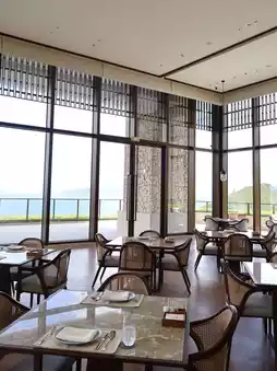 The wooden tea room is filled with a faint tea fragrance, with intangible cultural heritage Guangcai porcelain cups🍵 Tea lovers can enjoy tea while watching the sea, it’s incredibly relaxing~