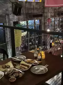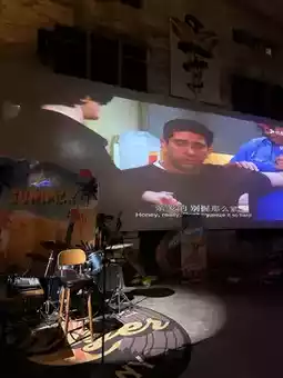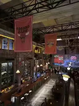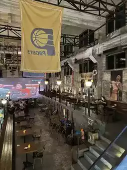 Industrial style bar design, cement walls, super high ceiling design, create a rough texture. The flags of the Chicago Bulls and New York Knicks were hung, as if they were in a foreign country. There is also a big screen and concert location for evening resident.