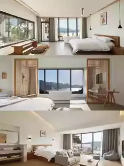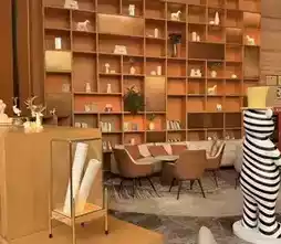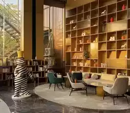 Lobby: Step into the hotel lobby, where the high ceiling design is paired with geometric patterned columns, and the revolving door reflects warm golden light✨. The marble front desk combined with metal lines exudes a sense of luxury, while the powder blue contrasting sofas in the lounge area🛋️ make every snapshot a stylish scene~