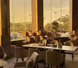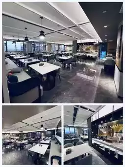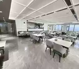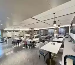 Restaurant: The breakfast area features an open layout, with black and white pendant lights hanging over neatly arranged marble dining tables🍽️. Floor-to-ceiling windows bring in plenty of natural light, and the dining tables display fresh fruit and freshly baked bread🥐, starting your day full of energy here!