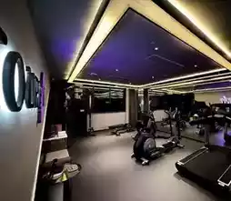 Gym: Mirror walls enlarge the space, and purple ambient lighting outlines dynamic lines💪. Equipped with treadmills, ellipticals, and more, you can enjoy city night views🌃 while working out, making fitness a true pleasure!