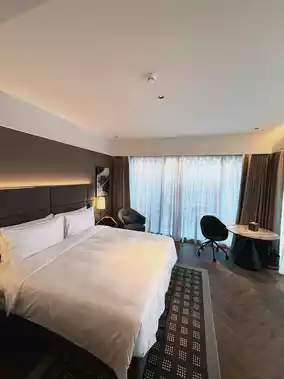 ✨ The moment you walk in, the lobby design hits you! Modern minimalist style with a touch of light industrial vibe, spacious and bright, even checking in lifts your mood~ The rooms are clean and comfortable, with soft, skin-friendly bedding. After a full day of walking in Macau, diving into bed is just so healing! 🛌