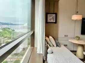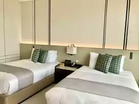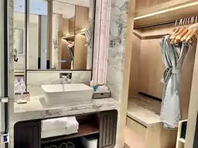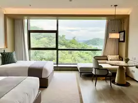 This time, we stayed in their Mountain View Twin Room, which is incredibly spacious with an area of over 50 square meters. Upon entering, the bathroom with a washbasin and a walk-in closet is on the left, while the right side features a bathroom equipped with both a bathtub and a shower. There’s even a bench in the middle, showcasing the ample space! The room includes two very comfortable large beds, a big sofa by the window, a round table with chairs, a wall-mounted large TV, and a multifunctional cabinet containing a mini fridge, an electric kettle, and a coffee machine with capsule coffee. It’s safe to say the room is fully equipped with everything you might need! Additionally, the room we stayed in offered a distant view of Zhuhai’s famous landmark, the "Sun and Moon Shells," which added even more charm to our stay! 👍🏼💯🏨📷😍