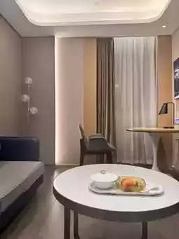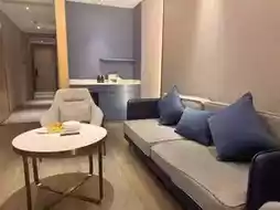 The elevator stopped gently on the 13th floor. As I opened the door, I almost thought I had stepped into a Nordic design studio. A gray-blue fabric sofa adorned with deep-sea-like cushions, a round marble coffee table holding freshly cut apples and oranges glistening in a glass bowl, and a disposable bathtub cover printed with "Healthy Travel"—every detail exuded thoughtful care.