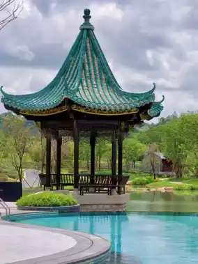 The hotel is located at the foot of Phoenix Mountain🌳, with Xiangshan Lake in front and lush tea hills behind. Covering more than 70,000 square meters, it only has 147 rooms and villas, which is quite spacious.