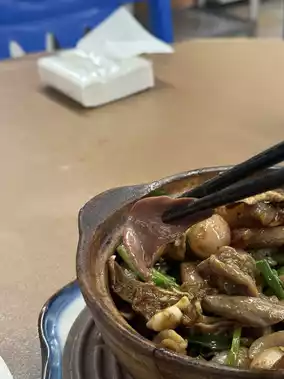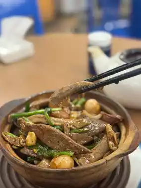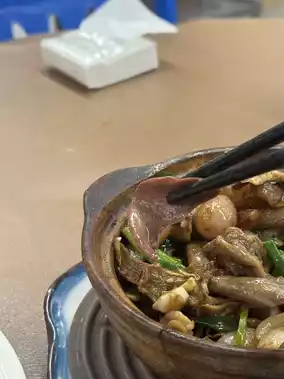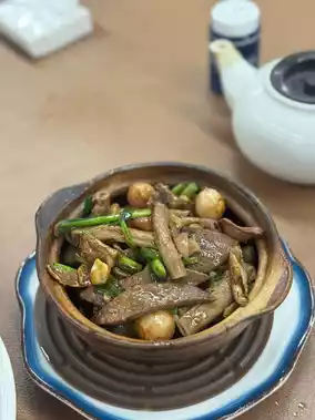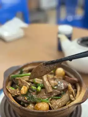 Jeje Pork Offal Hot Pot: Baked in a clay pot at high temperature, it's fragrant and rich in flavor. The abalone is chewy and tender, with the sweet flavor of the pork offal, and the high-temperature cooking enhances its crispness. The marinated pork offal is tender and juicy, absorbing the salty aroma of the sauce.