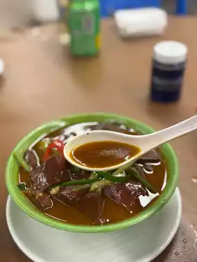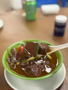 Chile and Pig Blood: The pig blood has a smooth texture like tofu, with a subtle metallic taste. After being cooked in the sauce, it absorbs the salty and savory flavor of the broth, creating a rich base. The unique spicy aroma of the chives neutralizes the fishy smell of the pig blood, while providing a crisp texture and a sweet aftertaste. The aroma is most pronounced when the chive segments are half-cooked. Perfectly prepared, the pig blood has no fishy smell and is salty, spicy, and delicious.