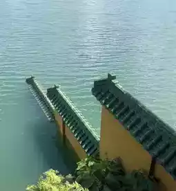 Yellow walls and green tiles complement the lush mountains and clear waters