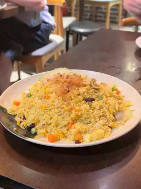 The Pineapple Chicken Fried Rice 🍚 is perfectly cooked with distinct grains, featuring pineapple 🍍, pork floss 🐷, cashews 🌰, cucumber 🥒, raisins 🍇, carrots 🥕, chicken 🐓, egg 🍳, corn 🌽, and green peas 🫛—a truly rich combination 😛.