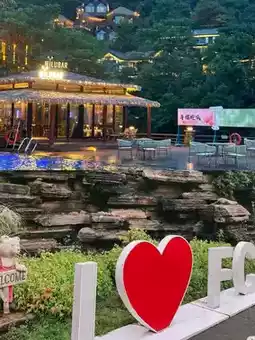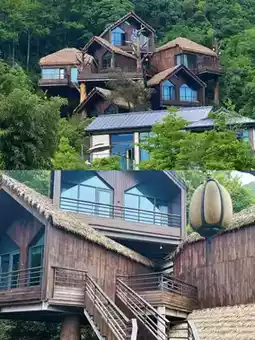 The hotel is surrounded by mountains and water, with treehouses in the jungle, triangular fishing huts by the lake, and a stream next to the petting zoo. The sound of the water is very soothing. The family room with a slide is sure to catch your child's attention, as is the petting zoo family room. Your kids will love it!
