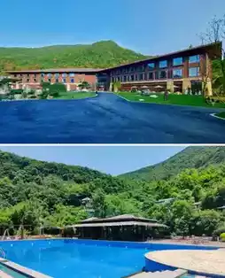 Fangcaodi Resort Hotel is my favorite family-friendly hotel. It is a romantic French-style hotel surrounded by 150 acres of forest. The hotel is surrounded by mountains and a river runs through the middle. In spring, the entrance to the hotel is lined with cherry blossoms. In summer, the hotel is surrounded by lush greenery. In autumn and winter, the mountains are covered in a gradient of colors. Many people who visit the hotel are amazed by its beauty.
