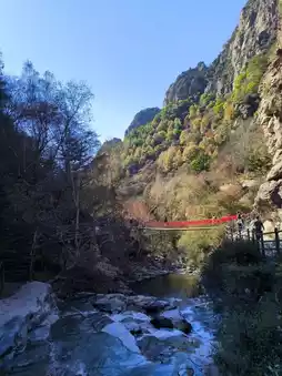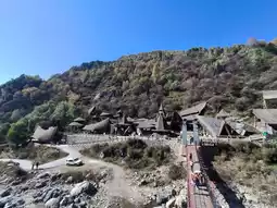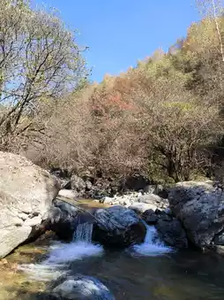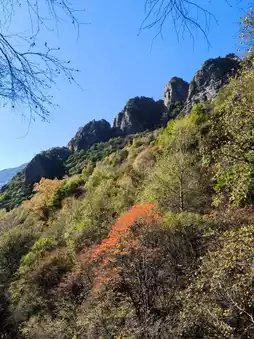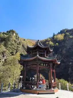 On October 3, 2024, 64 of us came to Yu County. Because Xiaowutai is a nature reserve and is currently not open, we were curious and wanted to visit Huichuan Scenic Area, which is close to Xiaowutai. This place has the most beautiful autumn scenery in the north. The ticket is half price at CNY 47, and the round-trip fare in the scenic area is CNY 30. If you don't buy a scenic spot bus ticket, it is about 2 kilometers to walk to the ticket gate, which takes half an hour. I took a car up the mountain. The winding mountain road has no scenery. It is just a climb all the way. There are some nondescript thatched huts similar to African natives on the mountain. There is a mountain god temple built in 2023 at the highest point. The main scenic spot of Huichuan is built along a mountain stream. There is a gurgling stream along the way, and waterfalls of various sizes converge into the mountain stream. You can walk down the wooden plank road to the ticket gate in 2 hours. A few hundred meters before the ticket gate is the return station of the scenic spot bus, and it is only a few minutes to the gate.