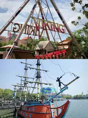 Here, you can personally experience the world-class high-altitude flying project 'Fly Over the Limits,' as if soaring through the sky and overlooking magnificent scenery; participate in the large dynamic space simulation flight 'Star Trek,' traveling through the vast stars; brave the 'Vesuvius Volcano,' feeling the shock and thrill of a volcanic eruption; immerse yourself in 'Dinosaur Crisis,' experiencing a thrilling dinosaur resurrection disaster; ride the 'Escape from Dinosaur Island' themed rafting, enjoying the thrill of rapid progress; step into 'Liaozhai,' unveiling the mysterious veil of traditional Chinese mythology; and stroll through the colorful 'Conch Bay,' as if entering a dreamy underwater world.