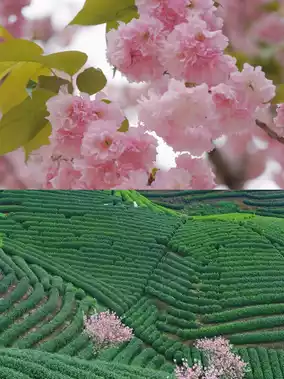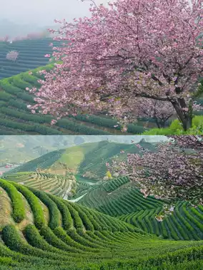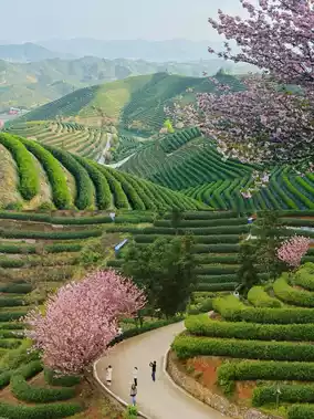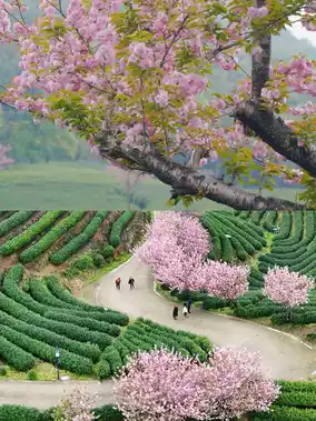 Here, you'll find a spectacular tea plantation spanning thousands of acres. As far as the eye can see, the mountains and fields are covered with tea trees, resembling layers of green waves. Even more delightful, late-blooming cherry blossoms are in full bloom, their delicate pink flowers dotting the tea trees. With "cherry blossoms between tea plants," this spring scenery is absolutely stunning, easily comparable to Dali's Wuliang Mountain.