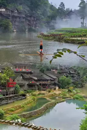 Paddle through stilted houses of northern Guizhou, capturing the perfect blend of ancient architecture and modern excitement.