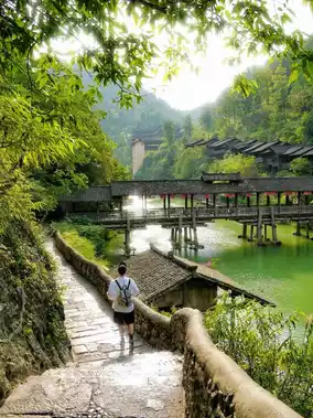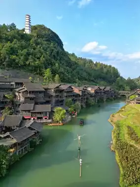 Take a rowboat, the emerald river ripples beneath the boat, and the stilted buildings on both banks reflect in the water.
