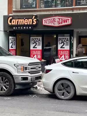 The sign outside of the front door says 2 slices of pizza and a soda for $3.99 including taxes. I tried to order for three of us. 6 slices and soda. Total $12.00. I was charged $28.00. When I tried to refer to the sign the guy “didn’t understand me”. Spectacularly average pizza. Which is what you’d expect for $12.00. Not for $28. Avoid.