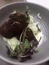 I did not have a reservation and was short on time so I sat at the bar which I was told had a full menu. My server was quick and attentive. The ice coffee was delicious and very welcome on a 90 degree day. I came for the falafel and ordered the eggplant spread to go with it. The falafel balls were crispy on the outside and light and fluffy on the inside=perfect! The garlic sauce they rested on was very tasty. The eggplant was smooth and smoky=perfect also! They came with warm soft pitas made in house with zatar, delicious!!