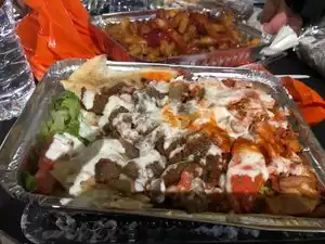The waiting time can be long, thus be here on time. It's possible to be standing in line for about an hour or longer, but it's totally worth the price. The quality of the meat and rice is exceptional. I ordered the mixed meat menu option, meaning I got lamb meat and chicken on top of spicy rice and the white sauce. You also get a piece of Middle Eastern bread with your order. And all of this for a low price of 10 dollars. It's an absolute steal. I highly recommend this place. They're located next to a small park area, so you can eat in peace. The portion size is generous. Make sure you know what you want, because they take the orders quickly and you don't have the time to stand and think about it when they're asking you what you want to eat.